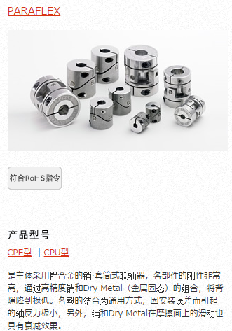 是主體采用鋁合金的銷·套筒式聯(lián)軸器,各部件的剛性非常高,通過高精度銷和Dry Metal(金屬固態(tài))的組合,將背隙降到極低。各轂的結(jié)合為通用方式,因安裝誤差而引起的軸反力極小,另外,銷和Dry Metal在摩擦面上的滑動(dòng)也具有衰減效果。采用利用摩擦的夾緊方式安裝到軸上,安裝非常方便。備有最大可容許4°偏角的CPU型和最大可容許1°偏角的價(jià)廉物美的CPE型。
